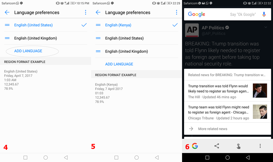 - Select English then pick a region that is not the US like, say, English (Canada), English (Kenya – yes, Huawei has this, not sure about other devices), English (India) etc.