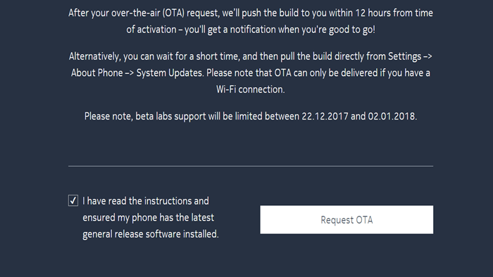 6. Once the device is validated, as per what is set out in step 5 above, scroll further down to request for the beta to be sent to your device over the air (OTA).