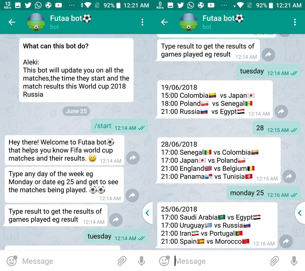 Just before the World Cup started, someone by the name Alex got in touch with me and introduced me to the Futaa bot. Its work is simple: tell you when matches are being played every time you ask it. Easy, no complications.