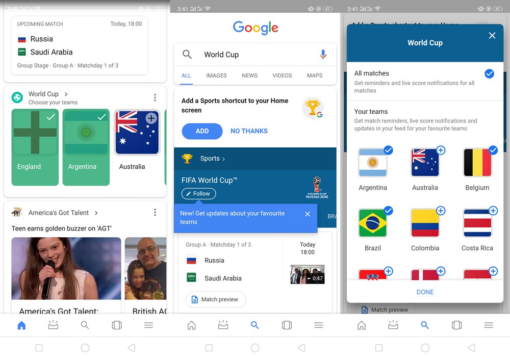 From the Google app, one can search for team news, match statistics, fixtures etc. Additionally, one can just scroll through the Google app’s news feed and they will still be greeted by information cards with the latest from Sochi, Moscow, Ekaterinburg and the rest of the Russian cities hosting World Cup matches. From here, one can follow specific matches or teams so that they get real-time alerts by way of notifications.