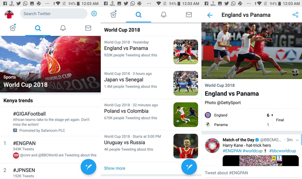 Fire up the Twitter app, log in and swipe right. The first thing that greets you is a huge World Cup banner which, when clicked, shows all the #WorldCup related chatter from the accounts that you follow on Twitter. Further down, just before the news section, Twitter has specific tabs for all matches for that particular day. Clicking through any of those tabs takes you to that particular match’s page complete with live scores and the latest chatter from around the globe.