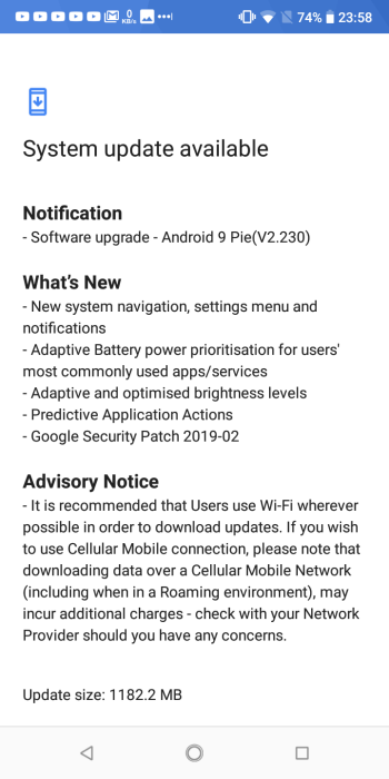 At just under 1.2GB, the update brings with it key Android Pie features like Adaptive Battery, Adaptive Brightness and App Actions.