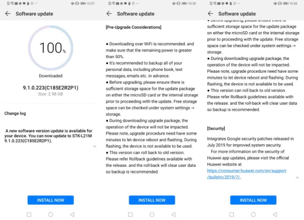The update clocks in at almost 3 GB so you may want to connect to a wireless hotspot or just be aware that you need to spare a similar number of data bundles before initiating the update download process. Since both the Y9 2019 and the Y9 Prime 2019 pack sufficient storage (64GB for the former and 128GB for the latter), sparing some storage for the update should be the least of our worries, no?